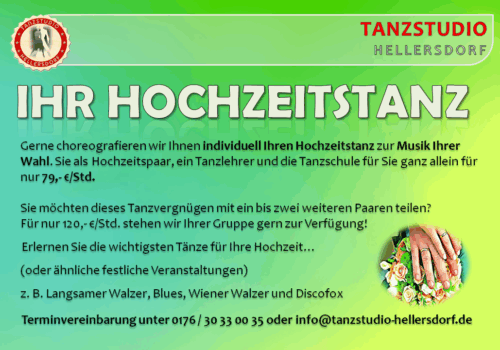 Tanzen per 10er-Karte! Ohne Vertrag, ohne Anmeldegebühr! Hier macht Tanzen lernen richtig Spaß. Auch für „Linksfüßler“ geeignet. Einstieg jederzeit möglich. Regelmäßige Kurse und Praktika für Tanzpaare und alle, die mal wieder ihre Schritte trainieren und üben möchten.