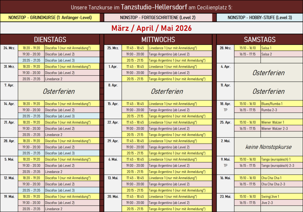 Wenn nicht angegeben, können die Paare den Tanz sich an dem Tag selber aussuchen, den sie erlernen/üben möchten!