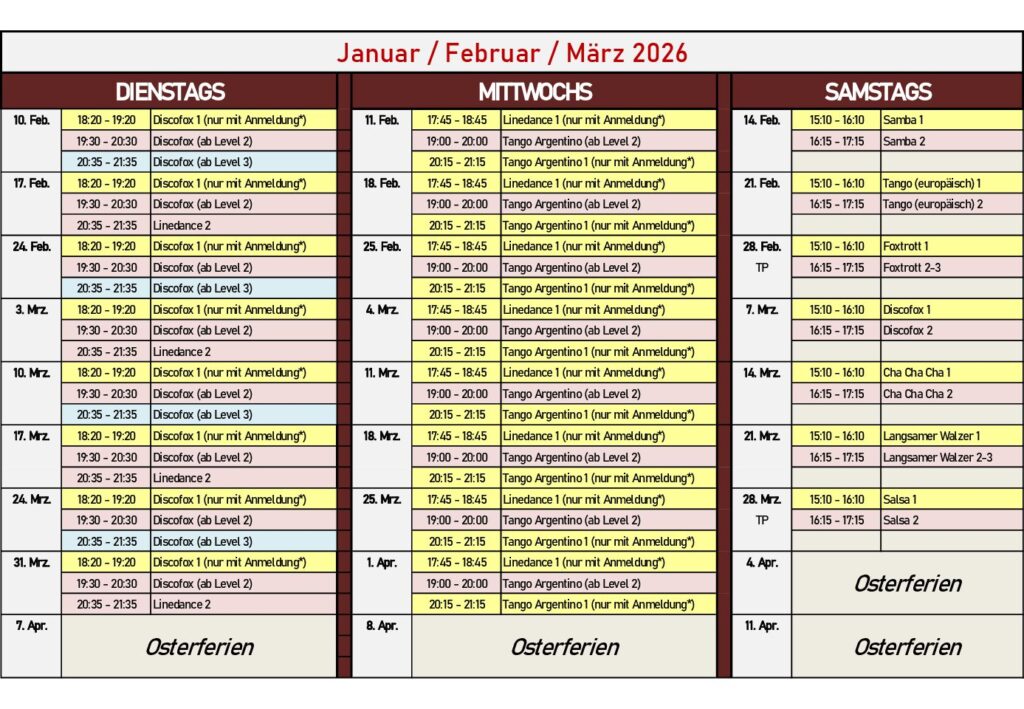 Wenn nicht angegeben, können die Paare den Tanz sich an dem Tag selber aussuchen, den sie erlernen/üben möchten!